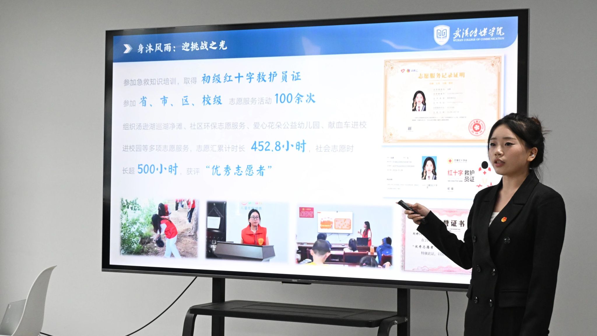 在个人陈述环节,候选人们依次登台,结合精心制作的PPT,从思想动态、学业成绩、科研竞赛、社会实践及未来规划等多个维度,全面展示了各自丰富多彩、硕果累累的大学生活。有的同学专业成绩优异,在学术探索上初露锋芒;有的同学积极投身于各类专业竞赛与项目实践,展现出优秀的策划执行能力;有的同学活跃于校内外各大媒体平台实习,创作出多篇有深度、有温度的新闻作品,展现了过硬的专业素养;还有的同学长期投身于学生工作和志愿服务,在服务集体与社会的过程中实现了个人价值。