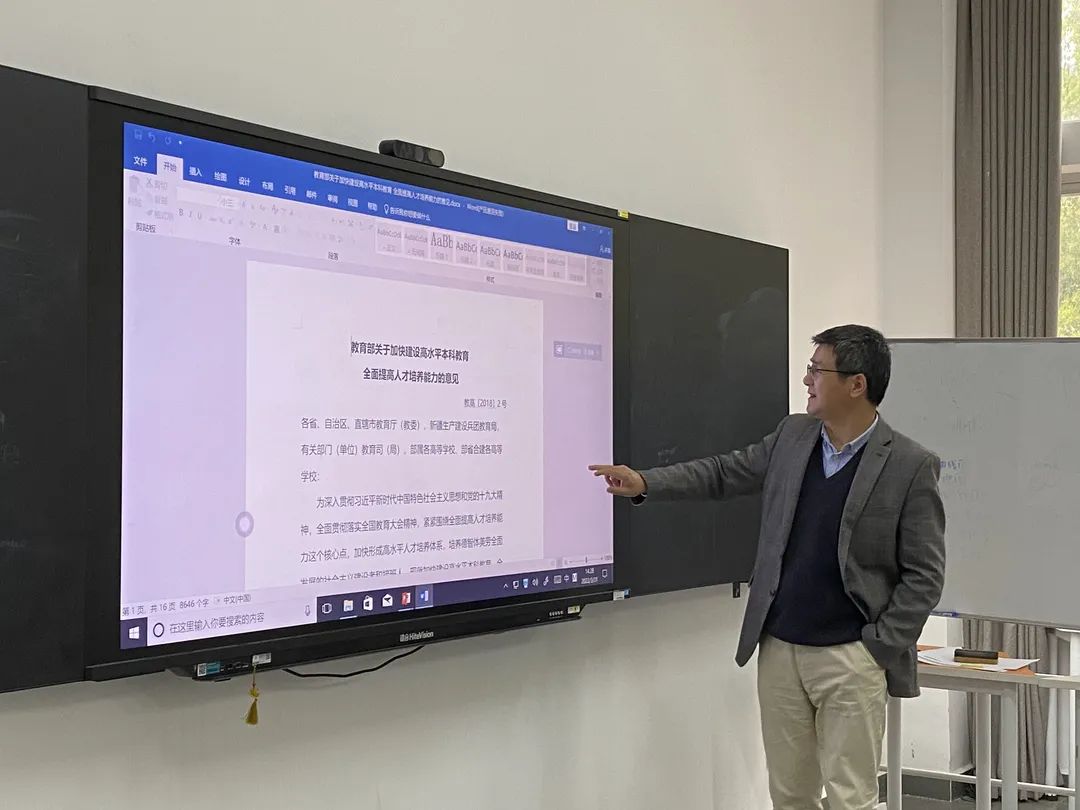 接着,他分析了一流本科专业的建设路径,多次举例讲解课程思政建设的重要性,并强调把课程思想政治教育贯穿人才培养体系,加强学生认知社会实践,开拓学生眼界。