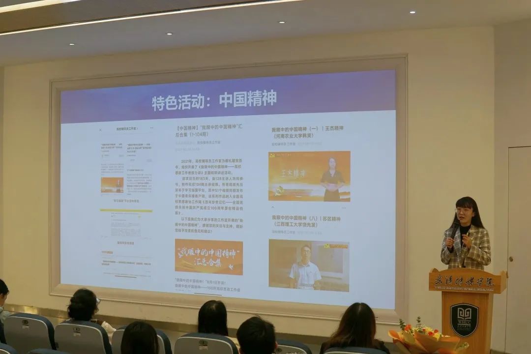 在会议过程中,王乃婧老师介绍了辅导员工作室的机构框架和运营模式、组织架构、特色活动等相关内容。她以“微特师姐”生涯发展工作室为例解说到:该工作室以“微特师姐”公众号和视频号为新媒体平台为微载体、以线下课程和线上精品沙龙课程为基础、以暑期社会实践为抓手、以生涯咨询、生涯发展系列活动为辅,致力于建立一套大学生职业生涯发展培养体系,基于三个平台满足服务学生成才成长。