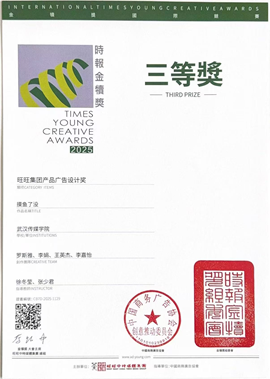 罗斯雅、李娟、王英杰、李嘉怡在徐冬莹、张少君老师的指导下创作的《摸鱼了没》荣获“旺旺集团产品广告设计奖”大陆赛区三等奖。朱冠宇、刘健宇、杨雅轩、沈嘉怡、高亚辉、邵文慧、陈霏雅、易灿粲、李佳蔚、肖依爽在陈姿莹、谢泽惠、卢愿、廖诗杰、谭漩老师的指导下创作的《饮一口氧 享一杯茶》荣获“武夷山水品牌行销企划案创作奖”大陆赛区三等奖。