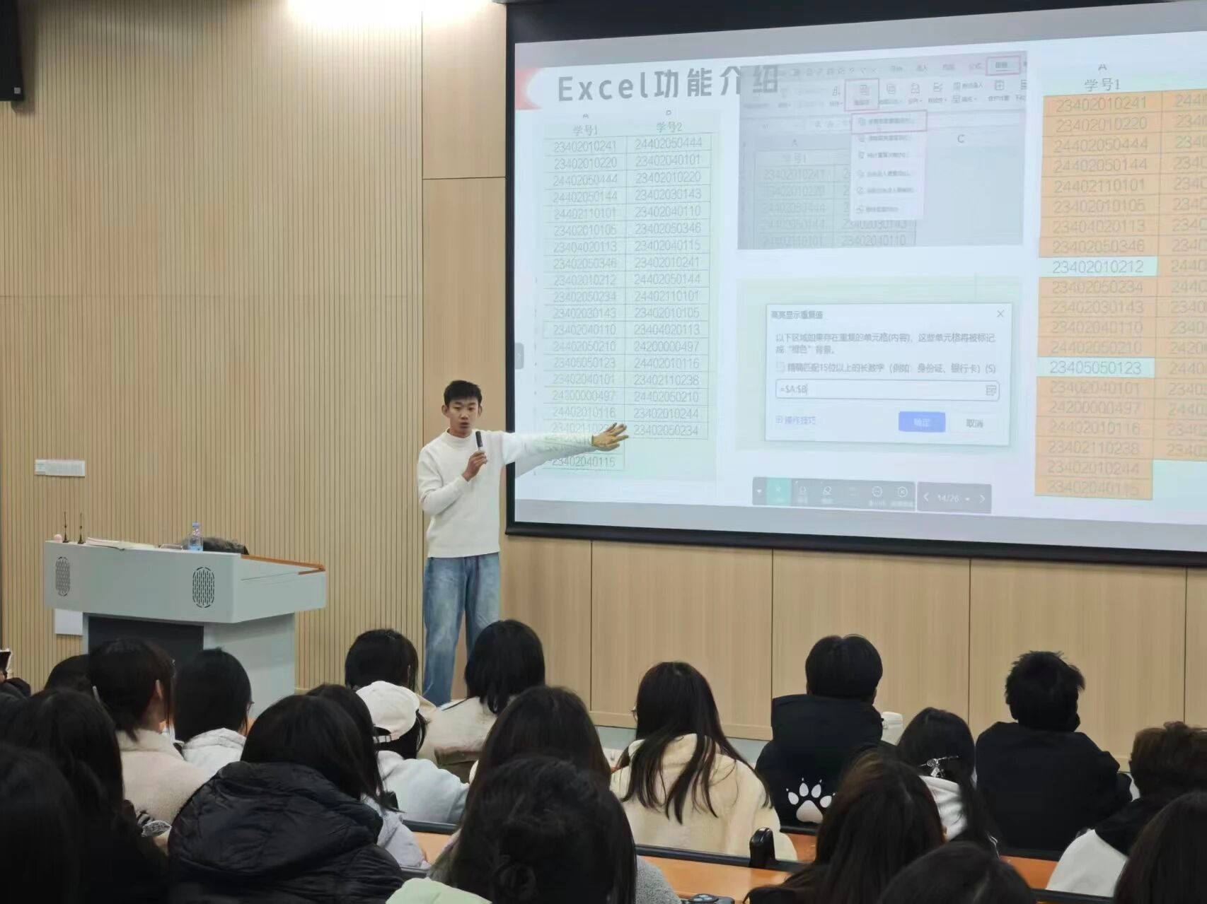 培训主要聚焦“Excel实用功能”与“公文格式规范”两大模块,结合班级工作场景开展实操教学:葛老师围绕班级信息管理高频需求,演示了信息合并、重复筛查、跨表匹配等实用操作方法。同学们在听完后,不少人解决了自己之前在数据整理中卡壳的问题,对之后的工作起到有效帮助。