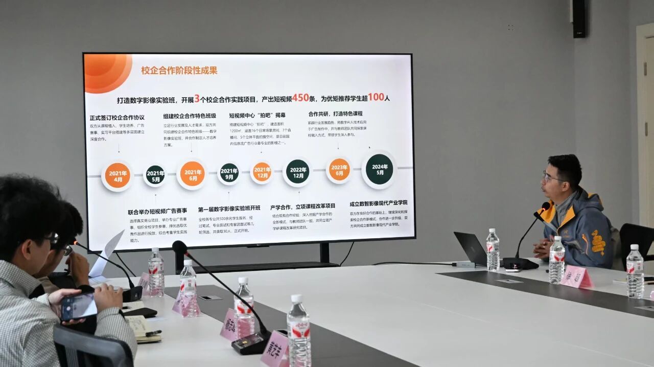 我校与上市公司“优矩互动”深度共建的“数字影像实验班”及产教融合模式,成为本次交流的重点关注内容。杜溪老师详细介绍了自2021年启动合作以来,双方从课程植入、共建短视频拍摄基地,到共办赛事、共设实验班,直至共建数字影像现代产业学院的进阶历程。