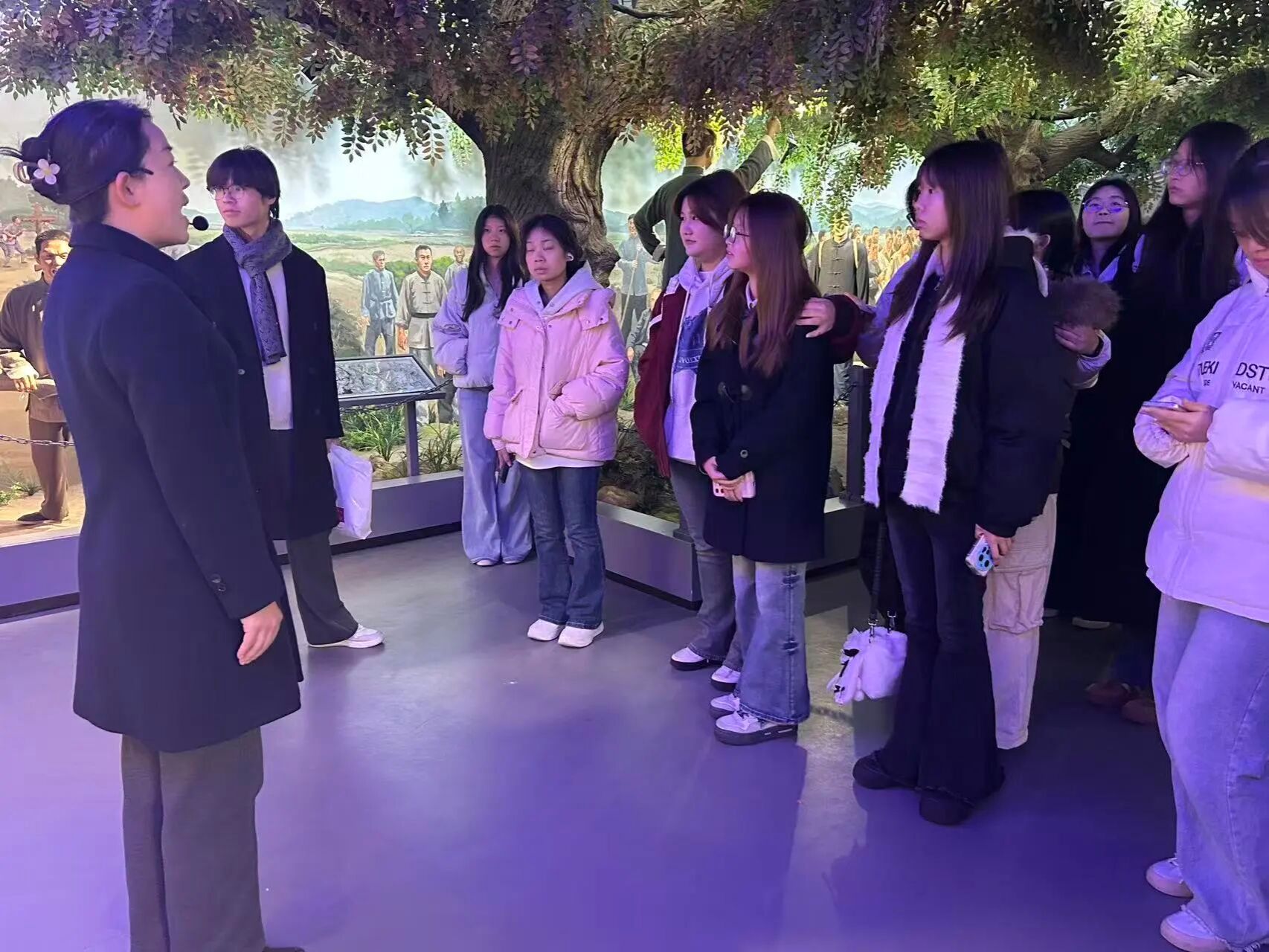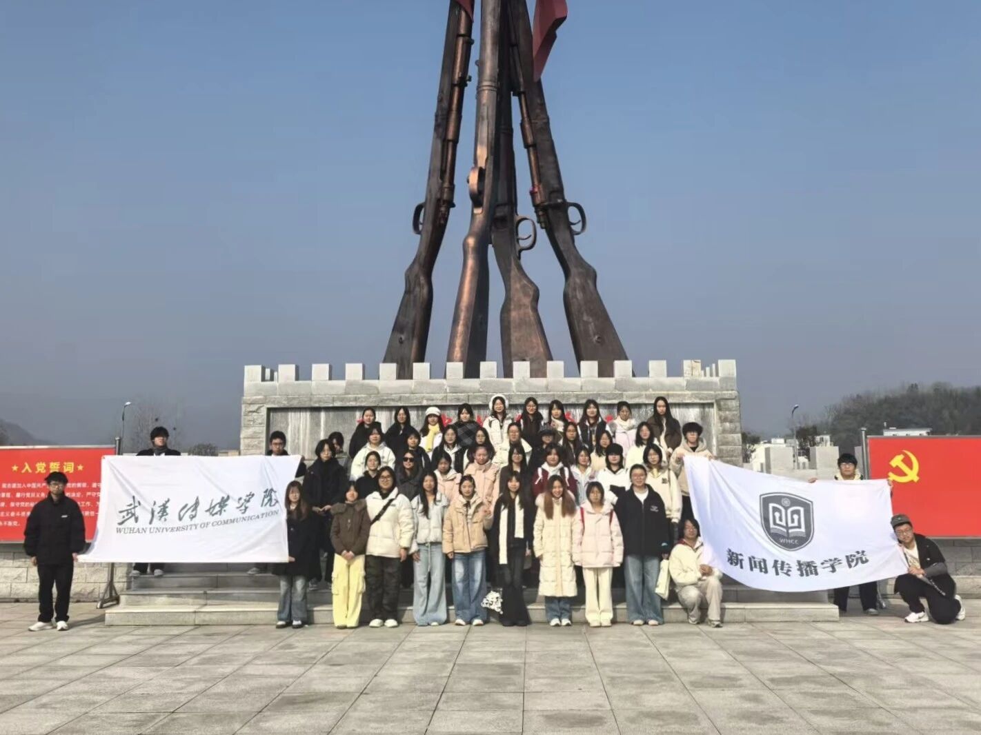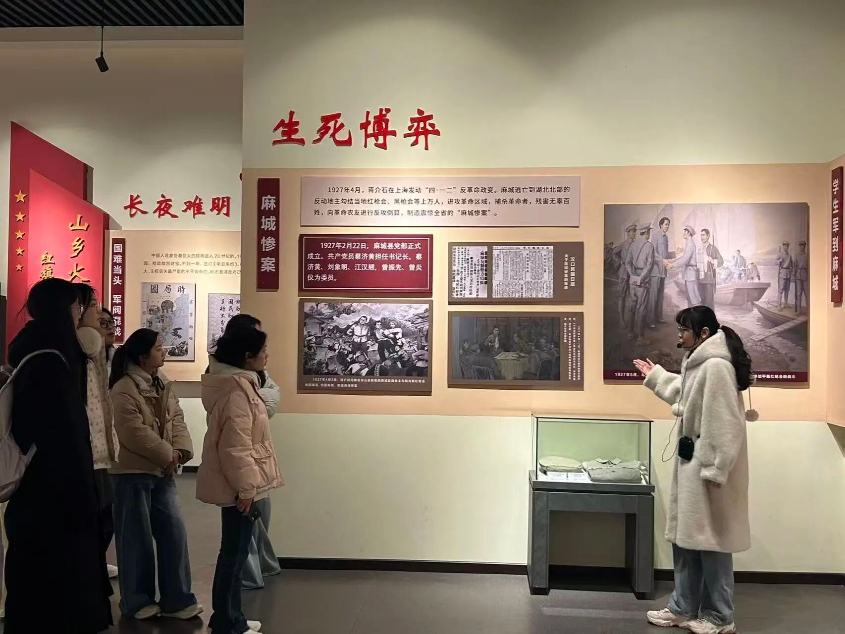 走进三条半枪纪念馆,映入眼帘的雕塑与展陈文物瞬间将同学们拉回那段烽火岁月。馆内详实的史料、珍贵的实物,清晰还原了“三条半枪闹革命”的壮烈历程,同学们驻足凝视,认真聆听讲解,深刻体会到革命先辈在物资匮乏、敌我力量悬殊的情况下,依然坚守信仰、奋起抗争的英雄气概,也对麻城作为红色革命根据地的历史地位有了更真切的认知。