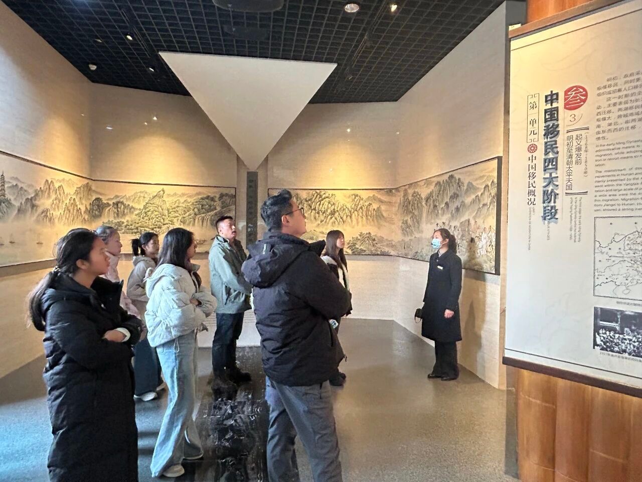 麻城移民文化公园展馆则为同学们打开了另一扇了解麻城的窗口,这里以“孝善”为核心,串联起移民文化与地域精神的脉络。从祭祖大殿的孝德传承,到移民文化博物馆里“湖广填四川”的历史印记,再到孝善楼中彰显的传统美德,同学们在参观中了解到麻城千年的文化底蕴,体会到孝善文化与红色精神交融共生的独特魅力,也对中华优秀传统文化的当代价值有了新的思考。
