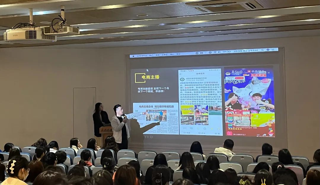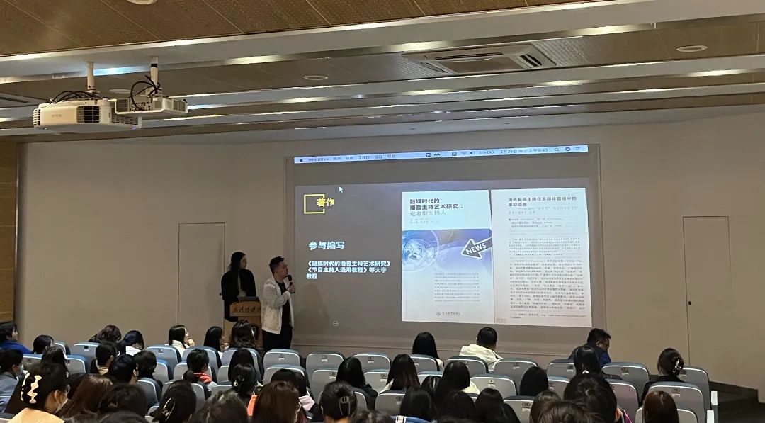 宣讲会的最后一个环节,一级播音员(中级职称)、武汉大学新闻学硕士、湖北经视主持人、湖北经视招生就业节目《博得offer》主播孙志博老师作为校外实习单位代表为同学们进行宣讲。他分别讲了自己在传媒、新媒体、校园三方面的杰出成果,并针对介绍了个人团队特色、高校探访类融媒体节目《博哥庆姐探专业》,通过主持人深入探访校园、特色专业、重点实验室等。