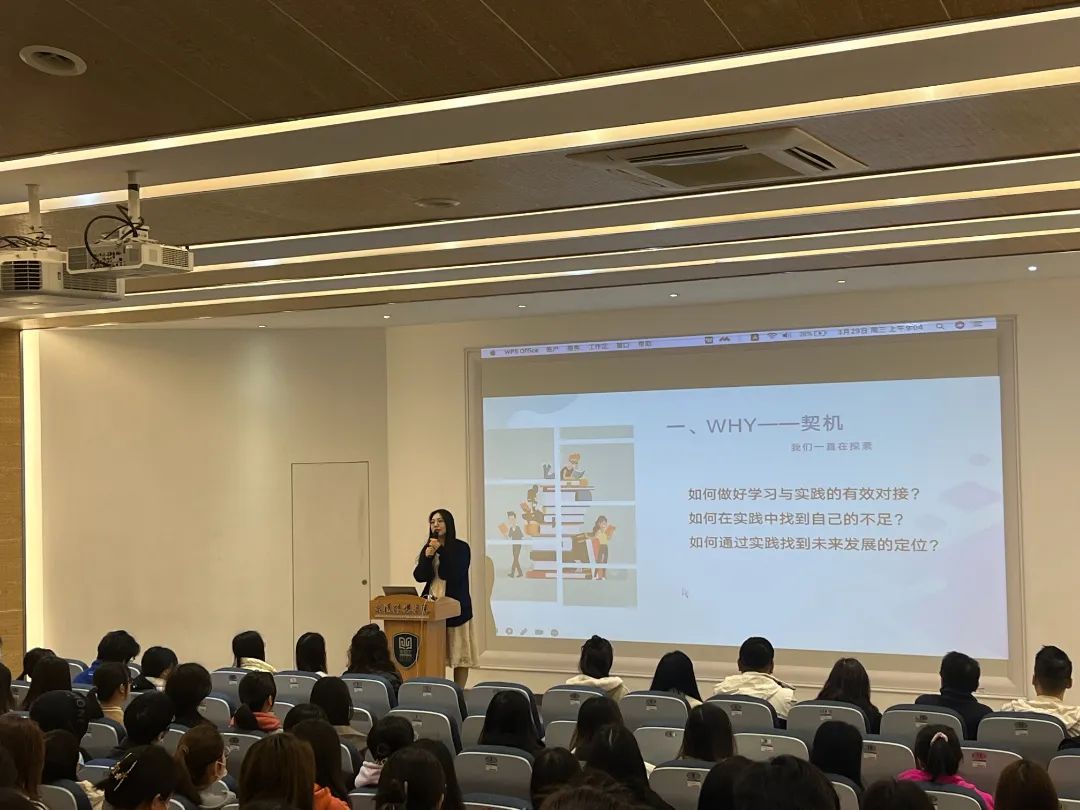 在各位新小传们进入大三下学期的课程后就会更加切身体验这个项目的具体流程,在学院带领下实现“课程——实习——就业”的有效联动。紧接着,杨郡媚老师也对在座的参会学生进行了问卷调查的互动,对于“心仪的校外岗位”、”对于校外岗位的志向”等进行大致的了解。在实习老师们提出对于大实习流程的注意事项后,我们也迎来了此次会议的下一个环节——实习代表的心得分享。