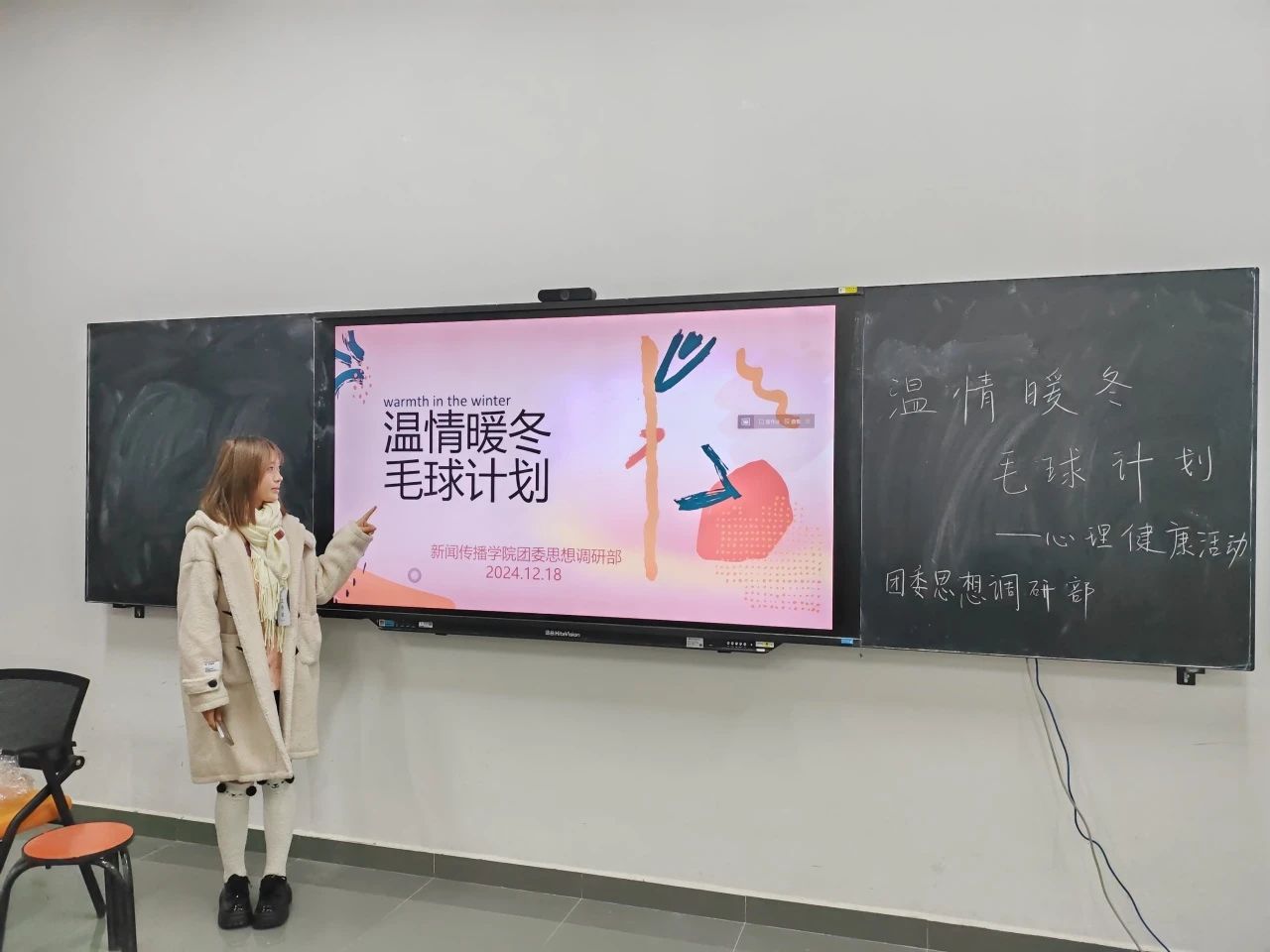 12月18日18时,77779193永利官网集团团委思想调研部分别在武汉校区的3106教室、大悟校区的3101教室举办了“温情暖冬,毛球计划” 活动。此次活动旨在让同学们感受丰富校园文化生活,在紧张的期末备考之余能够放松紧张心情,减少焦虑情绪。