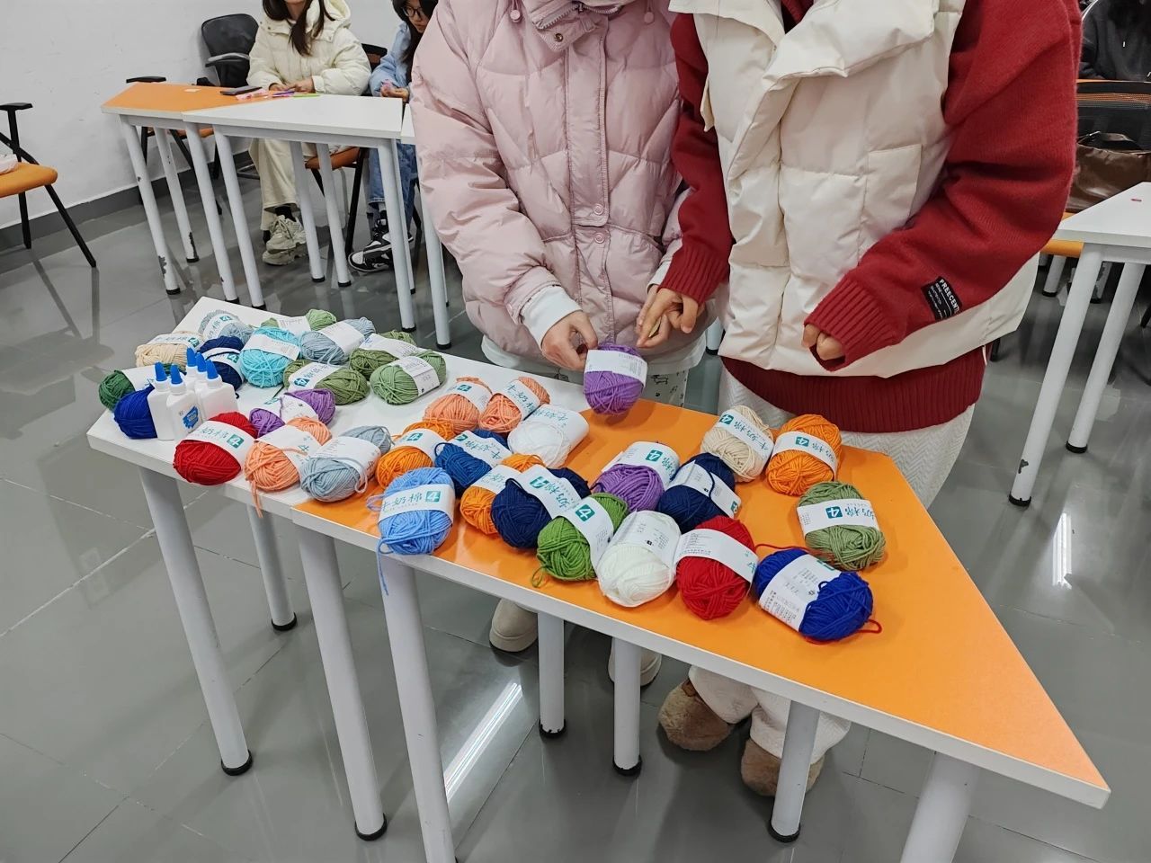 同学们积极参与,氛围热烈。游戏结束后,同学们按照排名挑选心仪颜色的牛奶棉线,开启钩织DIY之旅。