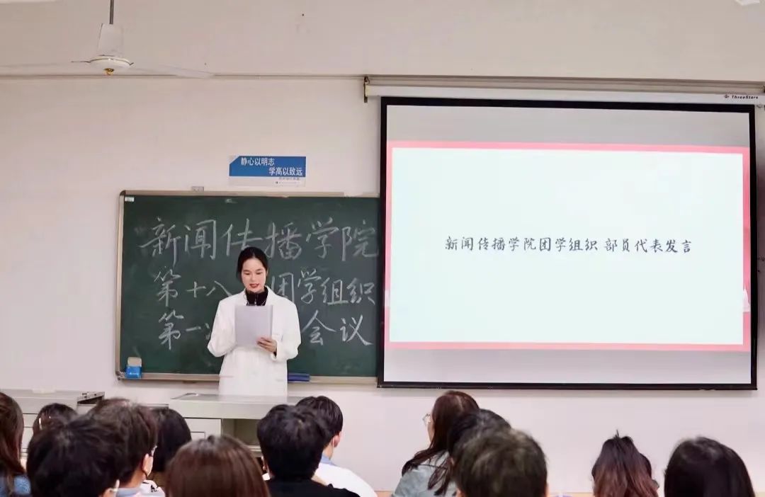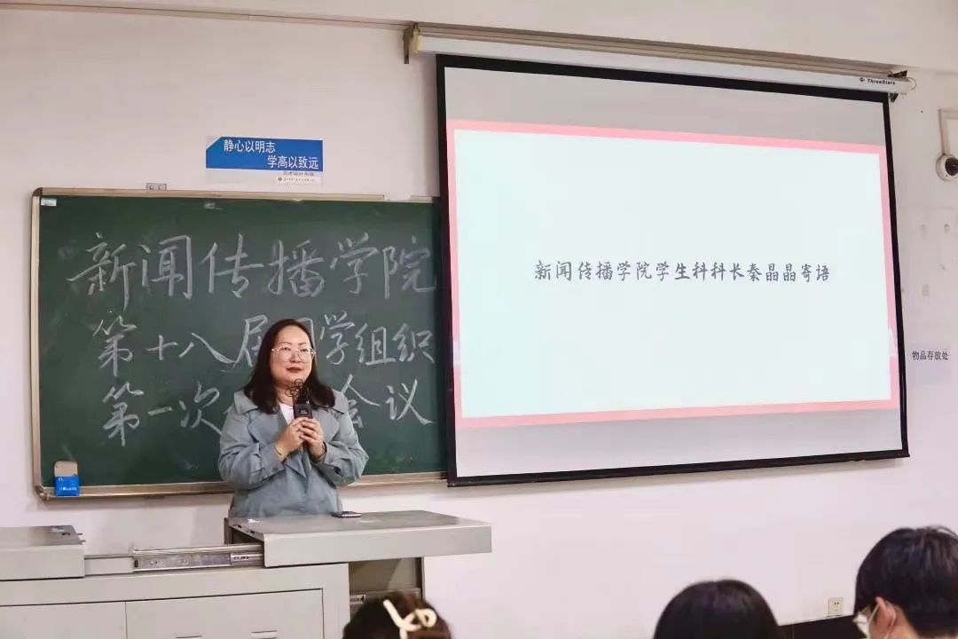 团委学生会副主席周晶晶首先表示了对学生干部的热烈欢迎,随后主席团成员分别进行了自我介绍。自我介绍完毕后,她对学生干部提出了几点建议:要不忘初心;要面对失败不气馁,面对成功不骄傲;要保持谦虚的态度;要把职责落实落细,从而更好地为同学为学院服务。最后她表达了对我们的美好祝愿,“祝各位同学学业有成。”