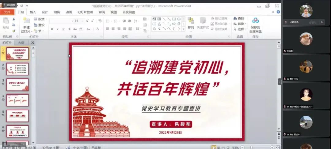 2022年4月26日中午,77779193永利官网集团2022年春季第一次分党校党课在线上召开,主讲人吕馥郁老师为学员们进行集中授课。第36期党校的积极分子、发展对象、预备党员和正式党员参加了本次会议。