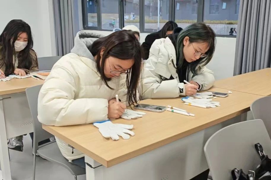 随后进行“雷锋手套DIY”环节。各小组根据答题得分顺序依次挑选手套和设计工具,发挥创意进行个性化设计。活动最后,同学们将精心设计的手套赠送给校园环卫工人、宿管等工作人员,以实际行动表达敬意与关怀,传递爱与温暖。