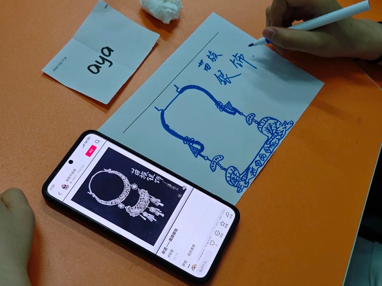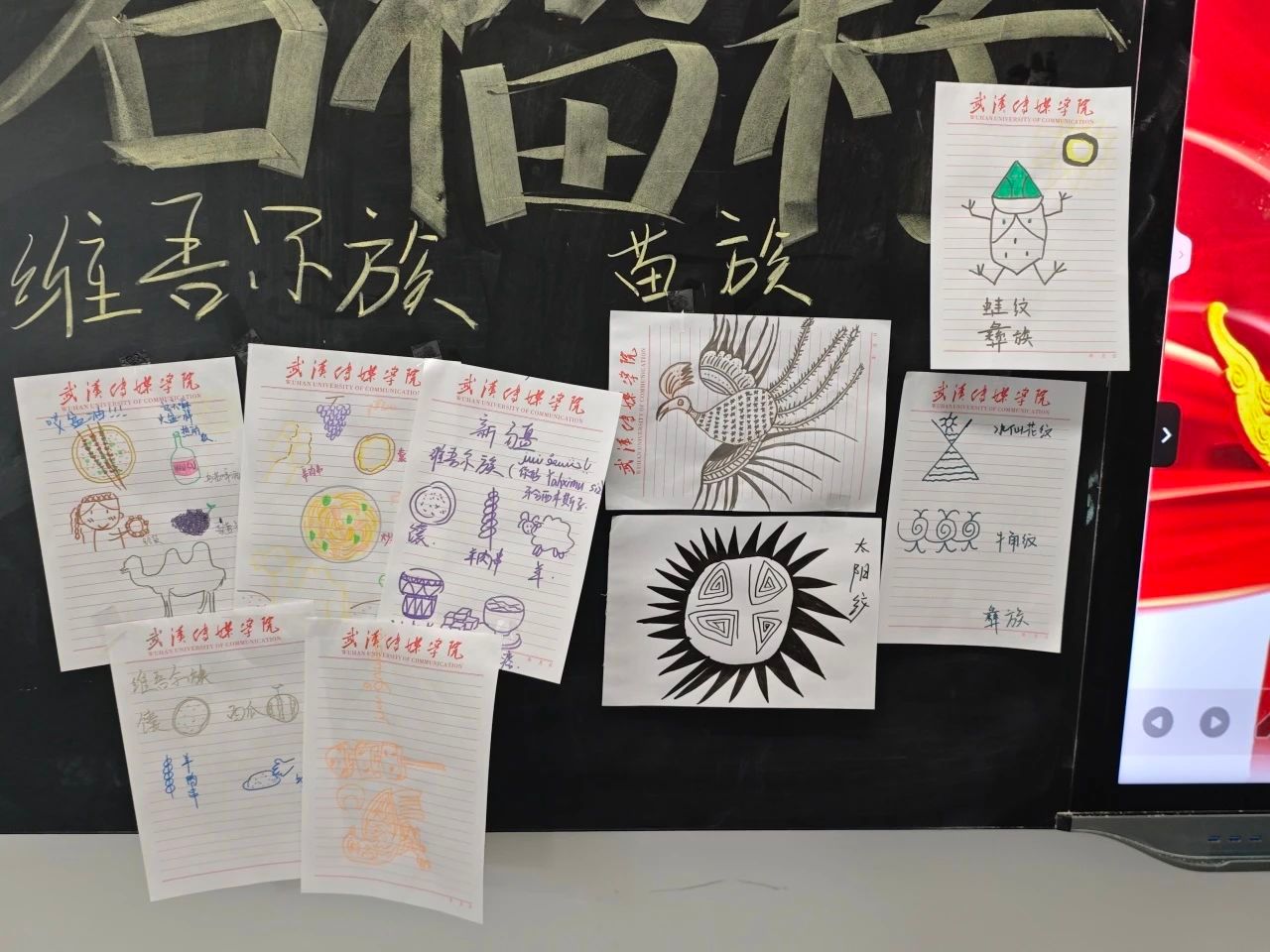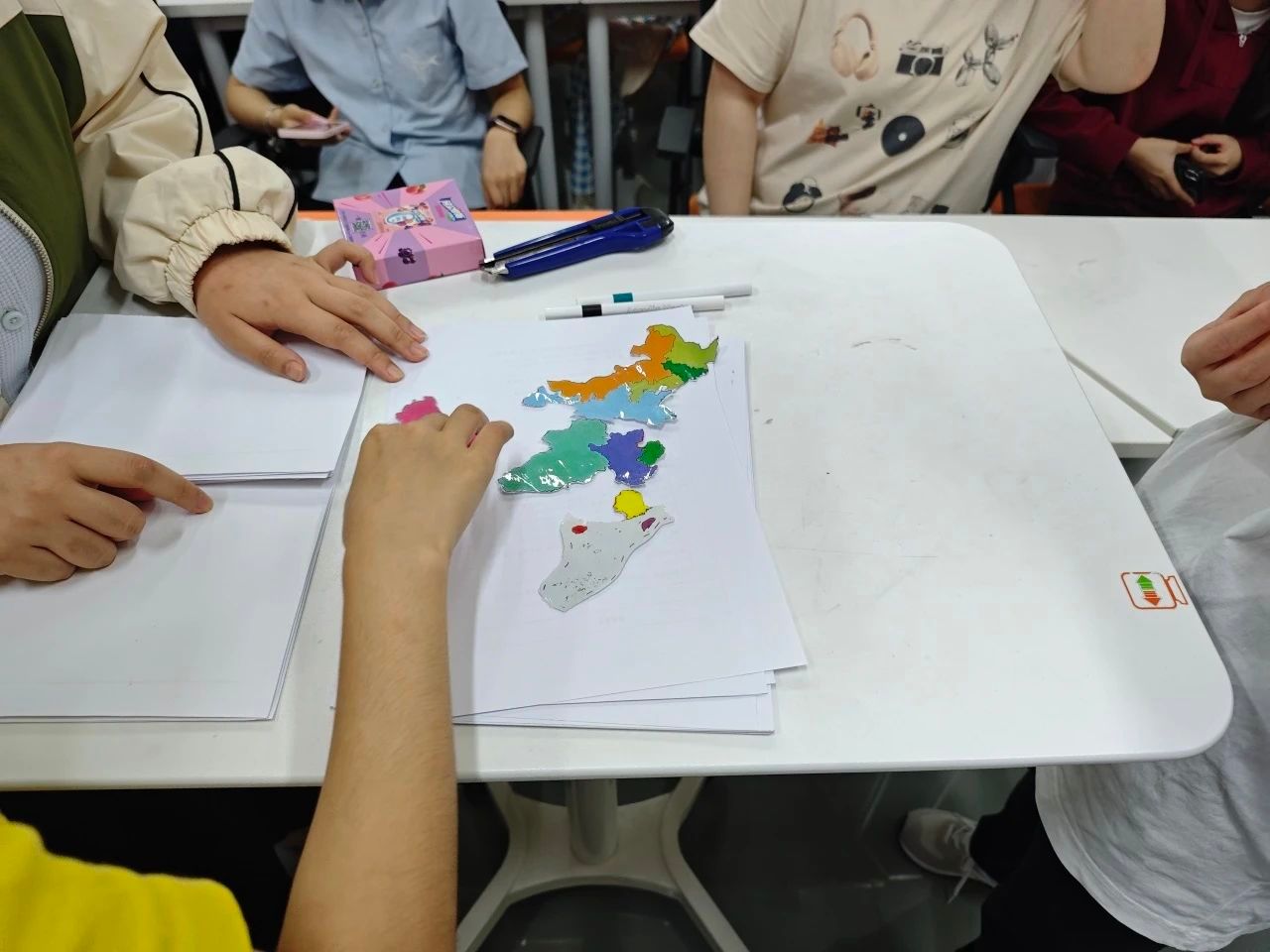 活动的高潮环节是“时空拼图”挑战。各小组领取一个少数民族聚居区的地图模块,根据图片线索猜民族特色美食,合作绘制一种民族传统纹样。然后,所有小组将获得的拼图模块拼在一起,共同组成一幅完整的中国地图,同时也把绘制的纹样张贴在黑板上,象征着中华民族“多元一体”的紧密联系。