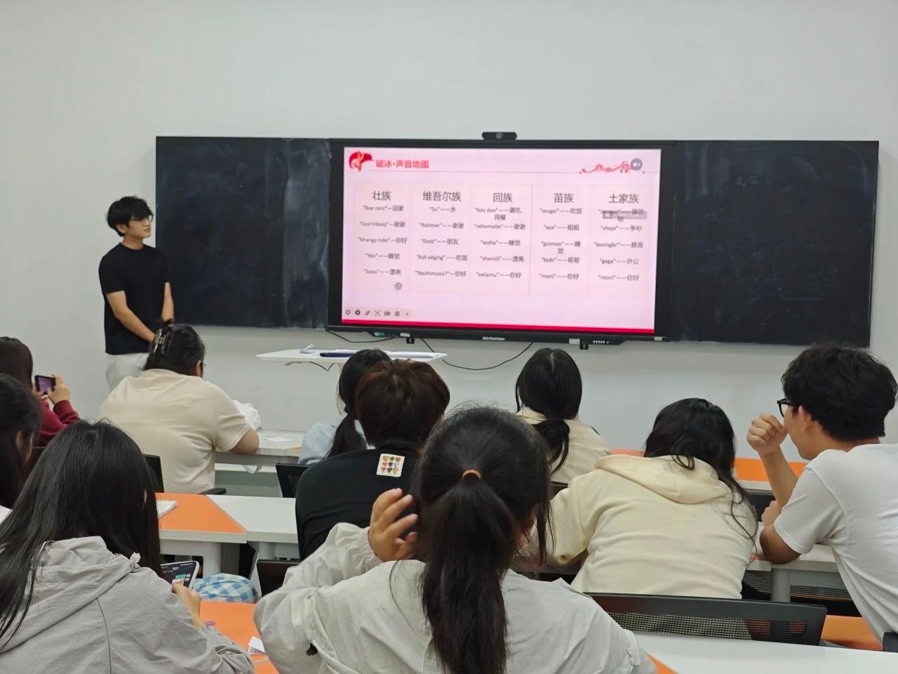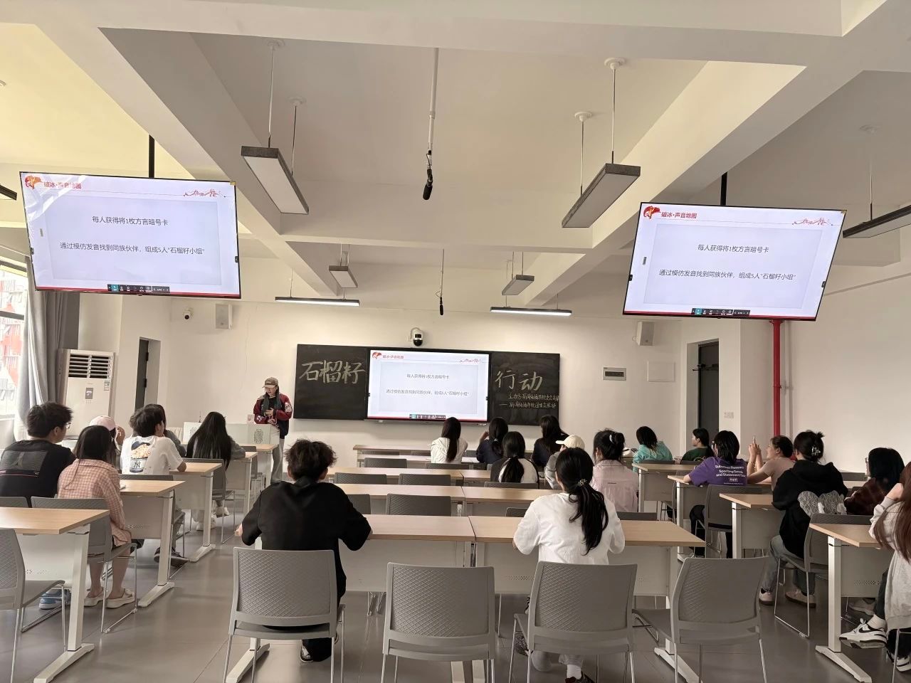 在“声音地图”破冰环节,每位同学随机领取一张“方言暗号卡”,通过模仿卡上的民族语言或方言发音寻找同组伙伴组成“石榴籽小组”,迅速拉近距离,感受各民族语言文化的独特魅力。