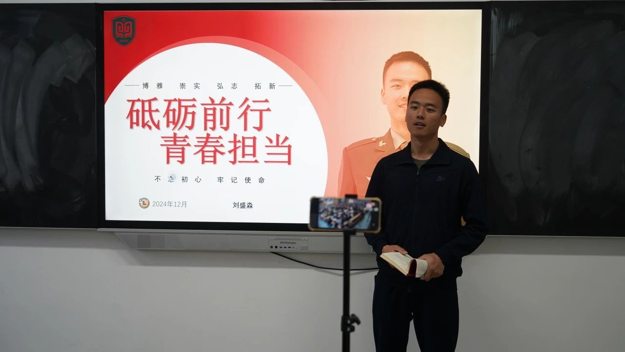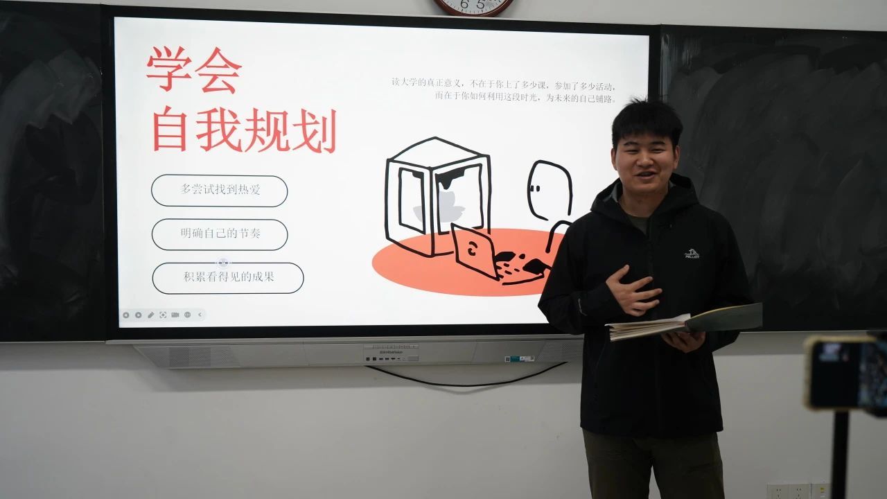 紧接着,刘盛淼学长为同学们讲解了大学是同学们人生中重要的成长阶段,不仅要追求知识的积累,更要培养良好的品德和坚韧的毅力。他鼓励同学们要志存高远,树立远大的理想和抱负。同时,他也提醒同学们要脚踏实地,一步一个脚印地实现自己的目标。在追求梦想的过程中,要遵循自然规律,顺应自己的兴趣和天赋,找到真正适合自己的发展道路。